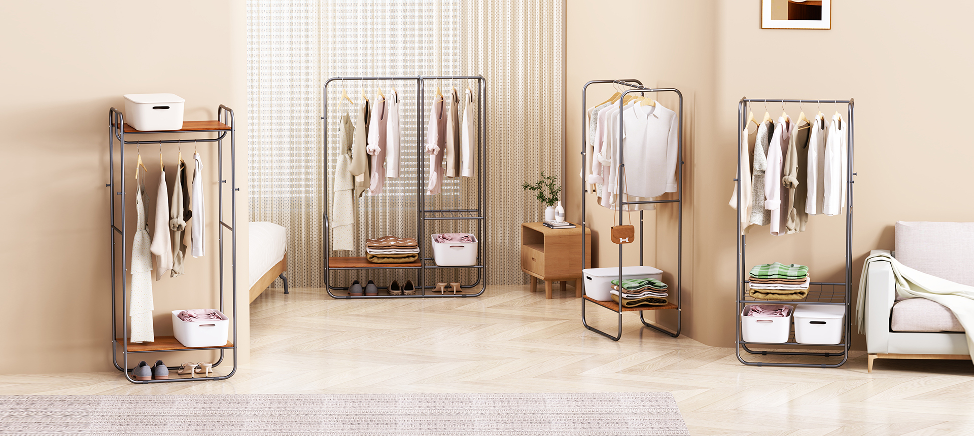 涵盖挂衣架、玄关桌、边桌、茶几、电视柜、置物架。