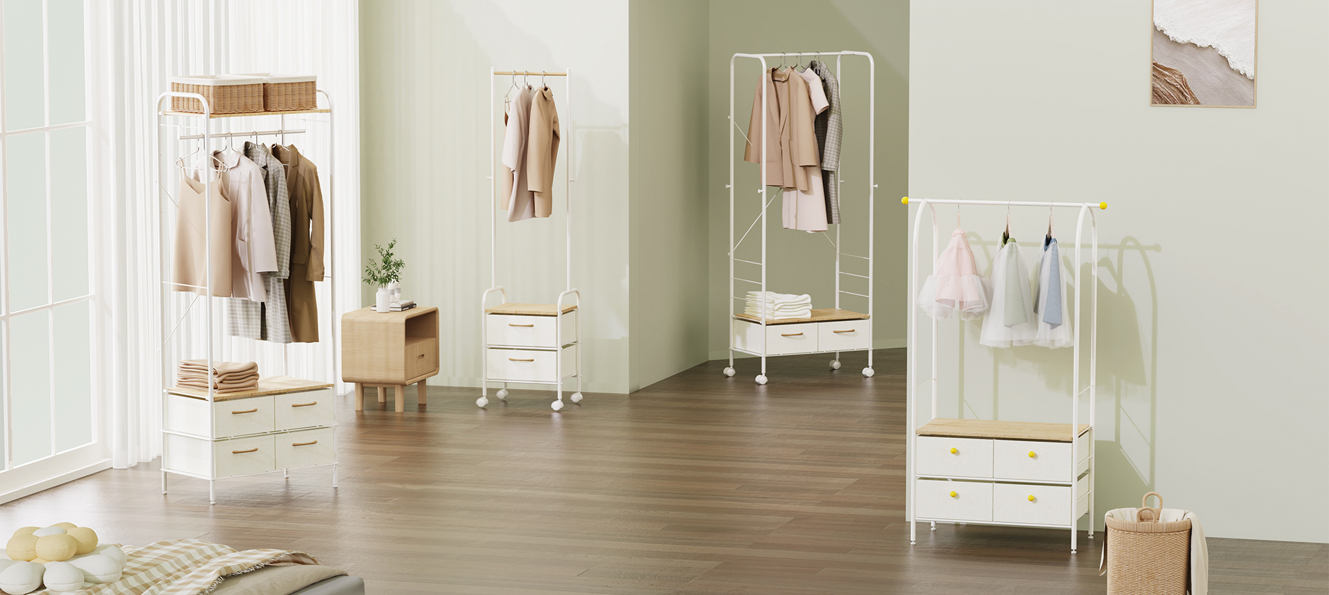 涵盖烫衣板、家用小推车、抽屉柜、晒衣架、脏衣袋、鞋架。